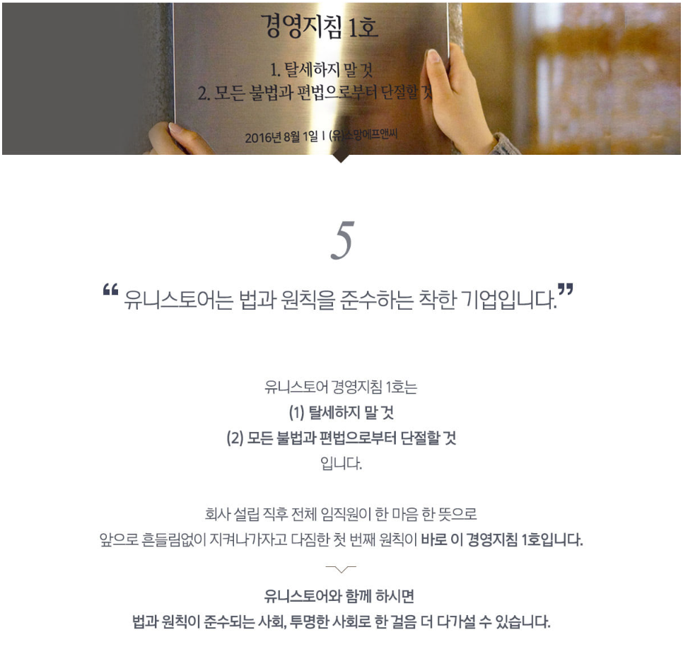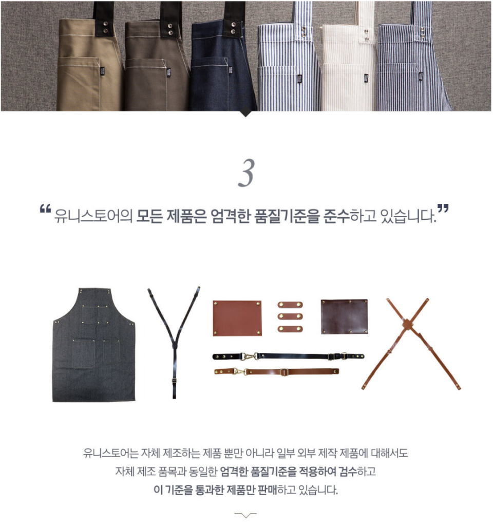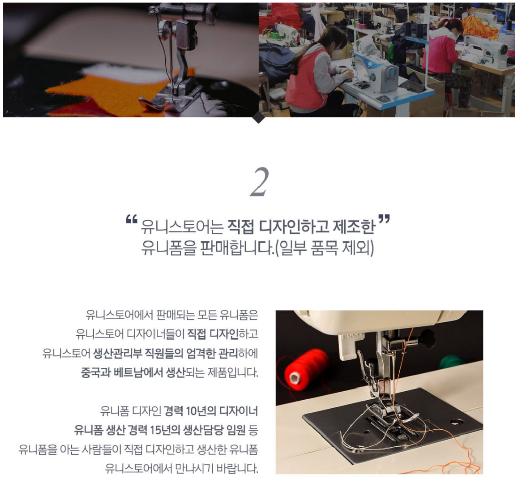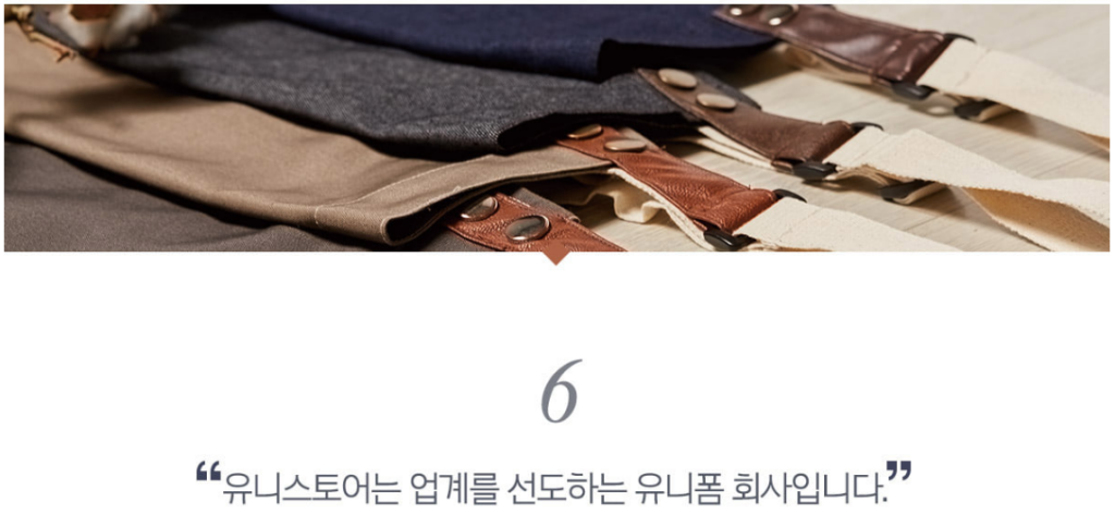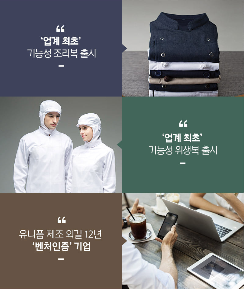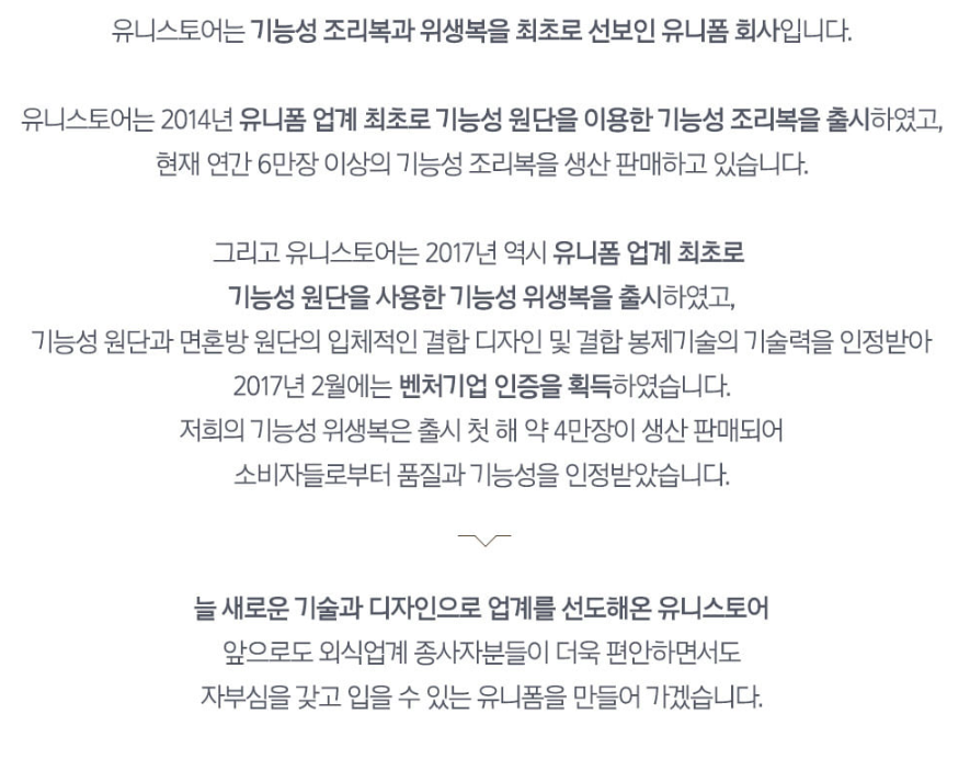 About "Professional Workwear Consulting Group" “유니스토어는 직접 디자인하고 제조한 유니폼을 판매합니다.” 만듭니다 유니스토어는일하는 사람들이 최상의 퍼포먼스를 낼 수 있는의류를 만듭니다. 추구합니다 유니스토어는 기업의 이윤보다는 고객의 가치 창출을 추구합니다. 노력합니다 유니스토어는최고가 되기 위해 최선을 다해 노력합니다. About us 회 사 명 유한책임회사 소망에프앤씨 설 립 일 2009년 4월 23일 / 법인 전환 2016년 8월 1일 대 표 방 보 훈 주 소 경기도 하남시 하남대로 934번길 25 사업영역 조리복, 위생복, 앞치마, 수술복, 작업복 등 제조 및 판매 매 출 액 4,606,707,062원 (2021년 기준) UNISTORE forchefs@somangfnc.com